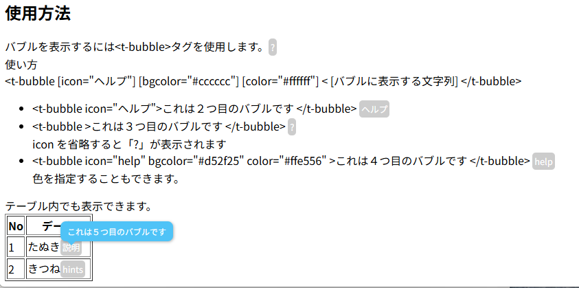 ホームページ上で?の上をマウスがホバーするとメッセージを表示してくれるアレです。<t-bubble>